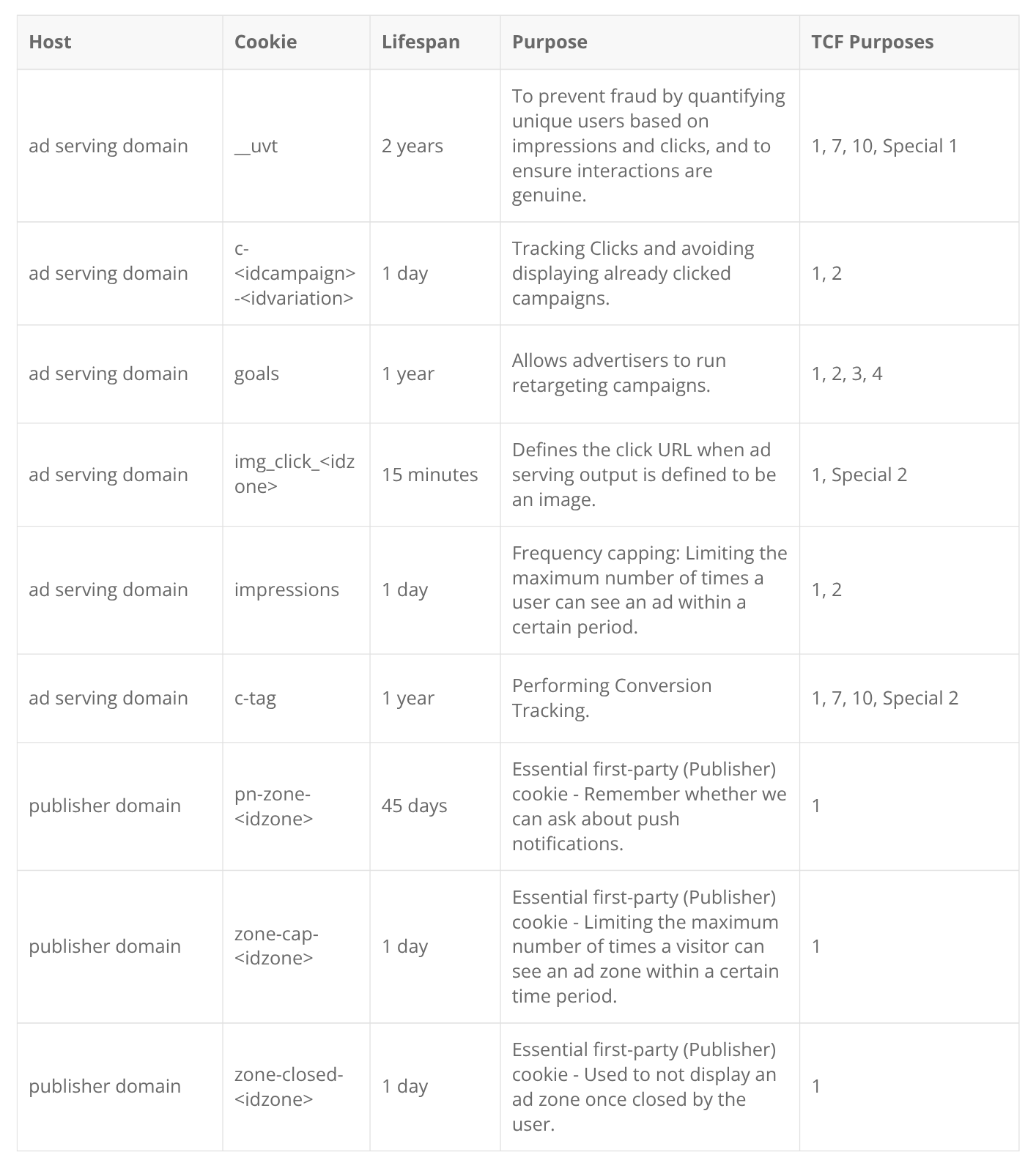 ExoClick Publishers must ensure that certain disclosures are given to, and consents obtained from its websites and/or app visitors (“End Users“) in the European Economic Area. Therefore, we can only drop an ExoClick cookie (third-party-cookie) with the End User’s prior consent. To this end, a full explanation of the adopted IAB Europe Transparency & Consent Framework Purposes (“TCF Purposes“) related to the following cookies can be found in section 3. e of our Privacy Policy. TCF Purpose ‘1’ refers broadly to cookies that may be stored or read on your device together with one or more of the TCF Purposes listed.