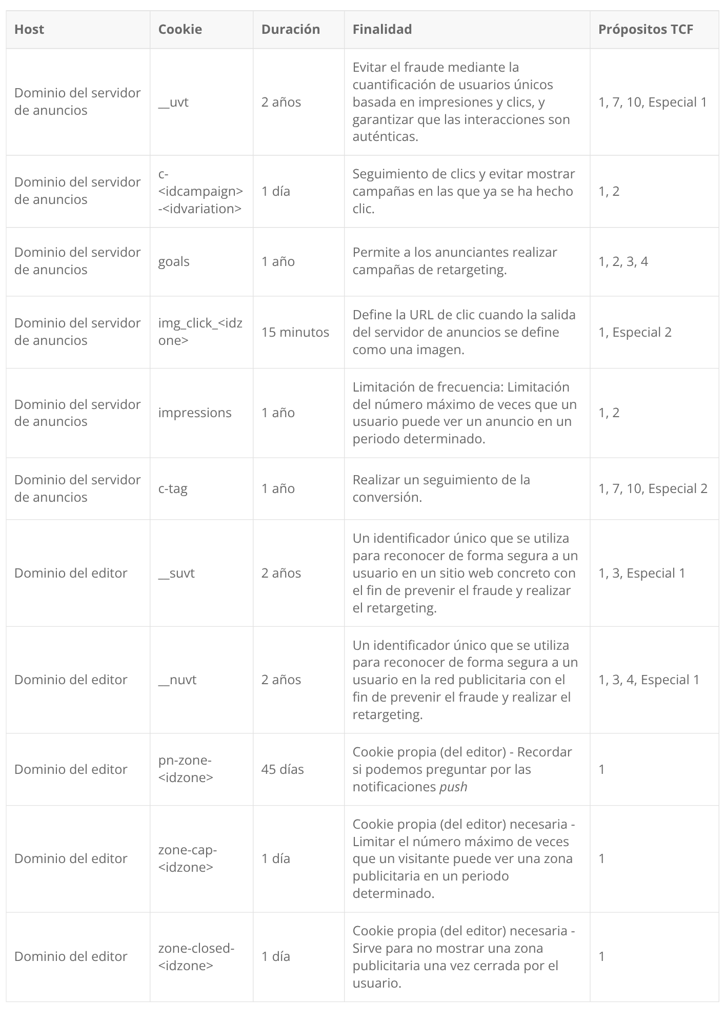 Los editores de ExoClick deben asegurarse de que se facilita determinada información y se obtiene los consentimientos de los visitantes de sus sitios web y/o aplicaciones (“Usuarios finales“) en el Espacio Económico Europeo. Por lo tanto, sólo podemos utilizar las cookies de ExoClick (cookies de tercero) con el consentimiento previo del Usuario Final. Con este fin, en la sección 3. e de nuestra Política de privacidad encontrará una explicación completa de los propósitos del marco de transparencia y consentimiento de la IAB Europe (“Própositos TCF“) relacionados con las siguientes cookies. El Propósito TCF “1” se refiere, en términos generales, a las cookies que pueden almacenarse o leerse en su dispositivo junto con uno o varios de los Propósitos TCF listados.