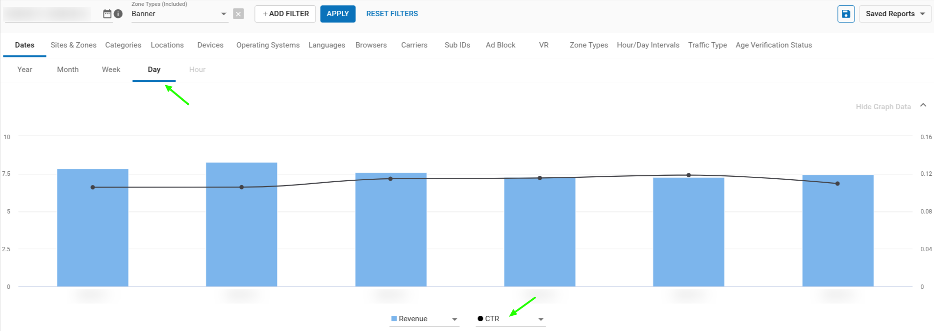 For example, for Banner zones, you can check the CTR by selecting the corresponding zone types or specific zone IDs in your statistics view: