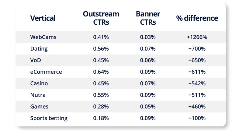 So as you can see Outstream has a huge percentage increase in CTRs compared to Banners, and giving you a better win ratio as you are paying less for much higher conversion opportunities. Test out Outstream today for a highly effective way to convert your offers, check out our Advertiser Guide to using Outstream Video for tips and best practices.