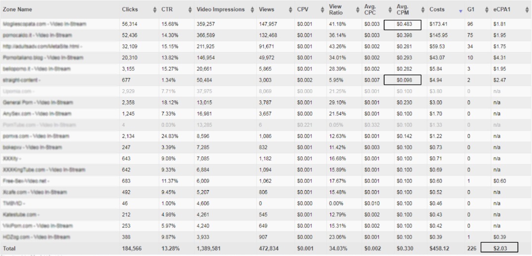 So after running a test on this campaign here are the statistics, related to the ad zones targeted, here you can see the ad zones blocked according to the 2 Rules set: