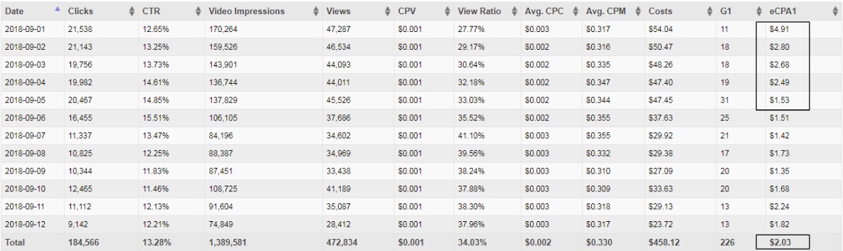Here you get an overview of the eCPA on each day of the 12 day campaign. As you can see each day the Bidder began to stabilize as it optimised more and more each day, with the average conversion cost at $2.03.