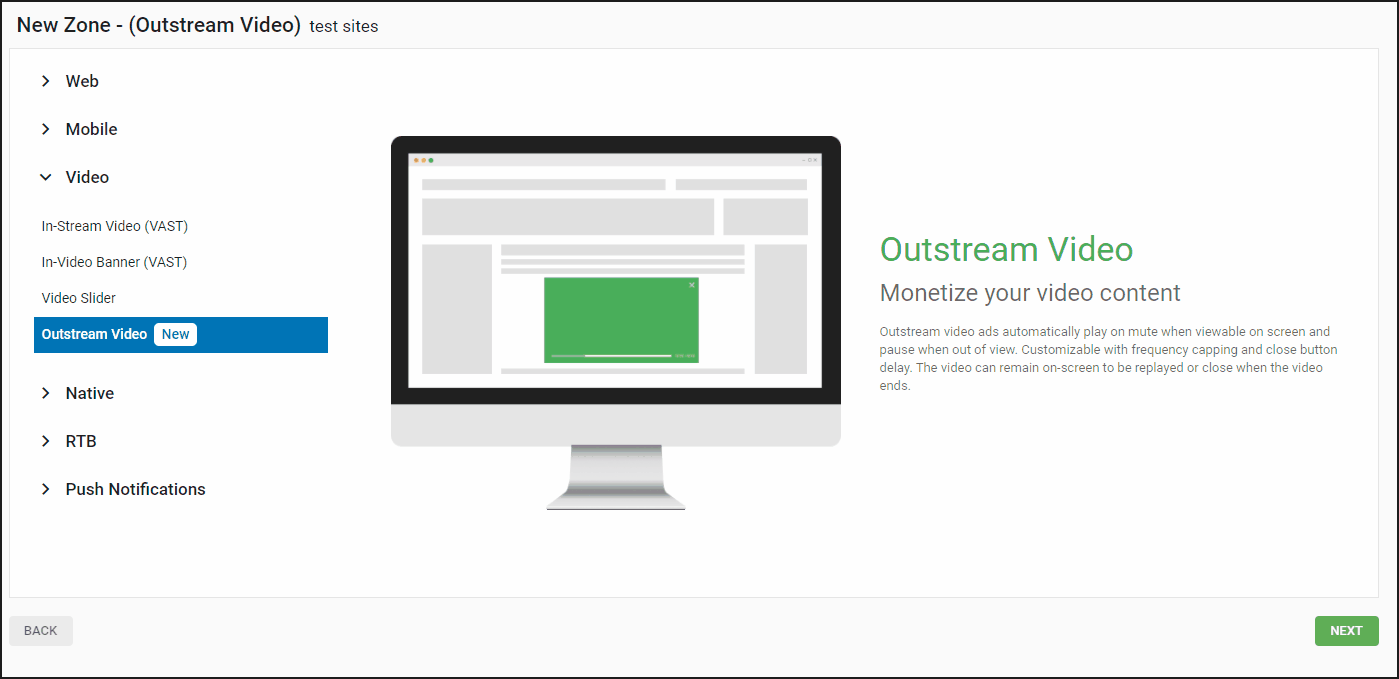 Select the “Video” category and from the drop-down menu select “Outstream” and click “NEXT”