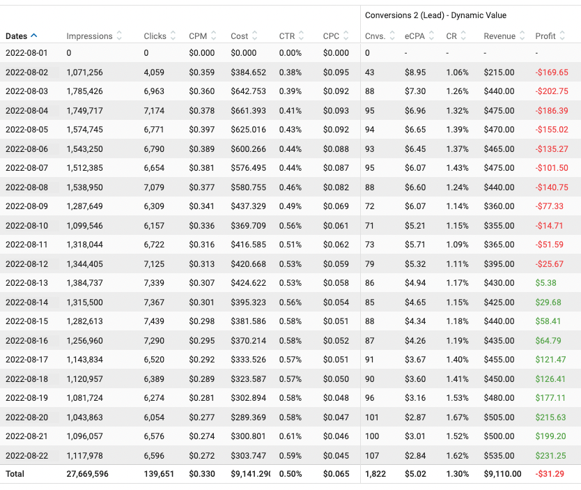 In this case, the eCPA decreased until reaching below 5$, which translates into green numbers in ‘Profit’ and ‘ROI’. From 2022-08-13, the Advertiser started making profit, after a couple of weeks of testing. Whilst this might seem like a fairly long stretch of time before making real gains on a campaign, it is a normal trend tendency since it takes some time for bidding algorithms to test out all ad zones and pick only the performing ones. For this reason, it is key for advertisers to devote some time and budget to testing pre-launch.